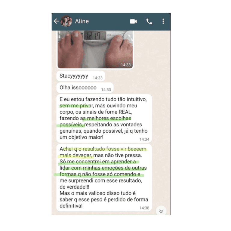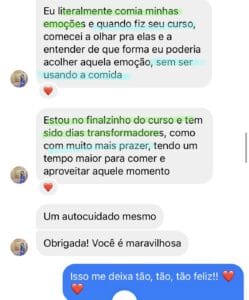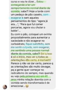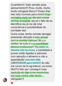 Ela me ensinou como comer consciente , a diferenciar fome emocional, a entender como me sinto em relação a comida, e como encontrar ferramentas pra identificar meus sentimentos e melhorá-los de uma forma diferente ao que fazia antes (comer).”